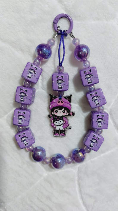A charming handmade bracelet-style bag charm featuring a kawaii anime girl pendant dressed as Kuromi, holding a mini Kuromi plushie. The charm is strung with purple cube beads printed with Kuromi character prints, alternating with galaxy/holographic purple beads and soft lavender pearl beads, all secured with a purple plastic lobster clasp ring — giving it a fully coordinated, all-purple aesthetic perfect for any Kuromi fan!