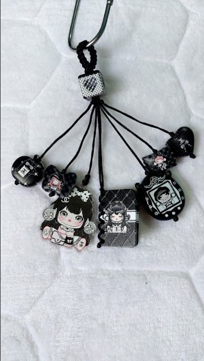 A sleek handmade tassel-style bag charm with a chic black and white aesthetic, featuring two kawaii anime girl pendants — one acrylic and one quilted square charm with a luxury-inspired pattern. Multiple dangling strands are decorated with black printed beads, small floral accents, and monochrome kawaii illustrations, all tied together with black cord, giving it an elegant yet cute dark aesthetic perfect for fans of chic kawaii style!