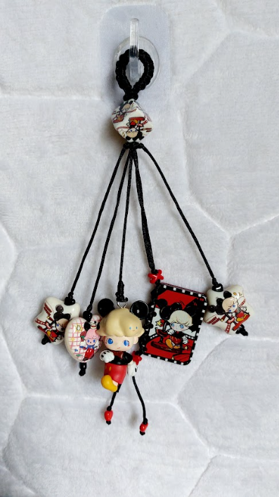 A fun handmade tassel-style bag charm with a bold red, black, and white color scheme, featuring a 3D kawaii doll pendant dressed in a Mickey Mouse-inspired outfit as the centerpiece. Multiple dangling strands are adorned with printed square and oval beads showcasing Mickey-themed kawaii illustrations, accented with small red crystal beads, all tied with black cord and a woven black ring topper, perfect for Disney and kawaii lovers alike!