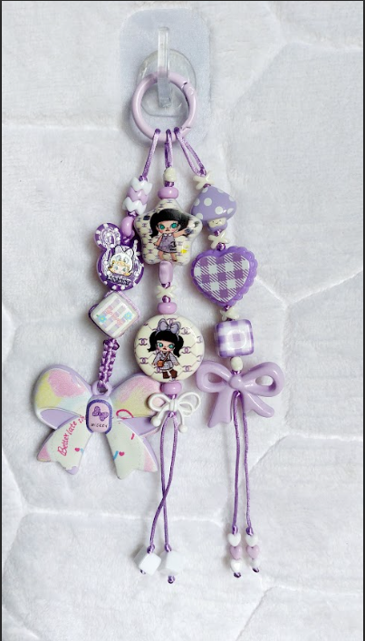 A delicate handmade tassel-style bag charm wrapped in soft lavender and cream tones, featuring adorable kawaii anime girl pendants paired with charming purple gingham heart and square shaped charms. Multiple dangling strands are decorated with pastel purple bow pendants, iridescent butterfly wings, polka dot mushroom beads, and dainty white and purple accent beads, all tied with lavender cord and secured with a light purple plastic clasp ring, giving it a soft, dreamy, and ultra-feminine aesthetic perfect for lovers of pastel kawaii style!